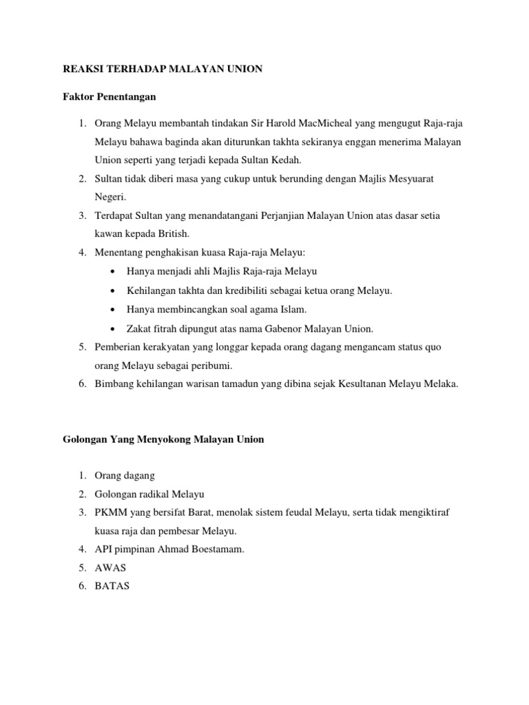 Reaksi Terhadap Malayan Union Pdf